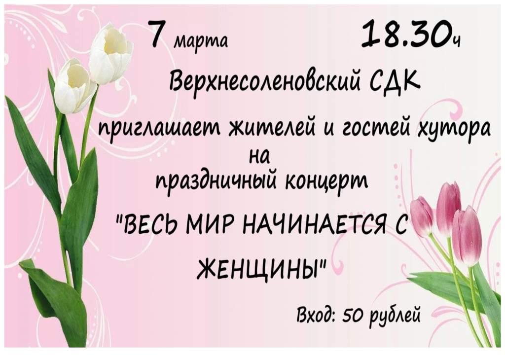 7 марта в 18.30 часов Верхнесоленовский сельский Дом культуры приглашает жителей и гостей хутора Вехнесоленый на праздничный концерт, посвященный Международному…