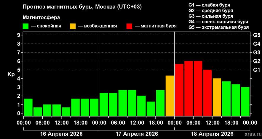 По данным лаборатории солнечной астрономии ИКИ РАН, геомагнитное возмущение начнётся вечером завтра, 17 апреля, и продлится до обеда субботы, 18…
