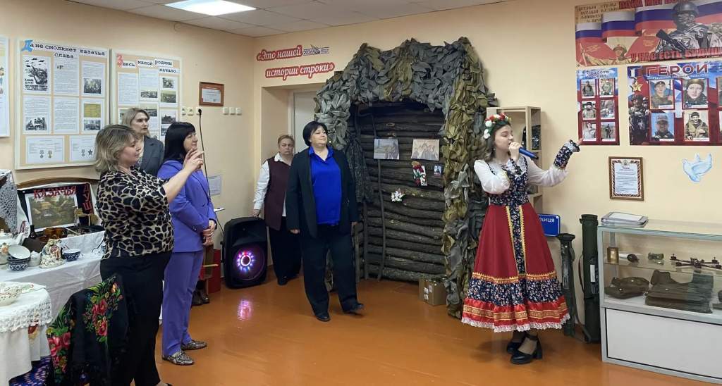 Алевтина открыла наше путешествие по экспозиции авторской песней о школьном музее. В ее проникновенных строках прозвучали истории о казачестве, о народах, проживающих на Донской земле, о героях Великой Отечественной войны и о мужестве наших современников, участвующих в СВО. Это было трогательное напоминание о том, что память о подвигах живет в наших сердцах.
