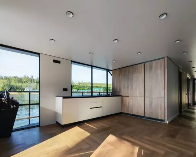 Первый этаж плавучего дома представлен рулевым постом, гостинной с кухонной зоной, санзулом, двумя каютами и сауной. Высота потолков — 2,2 метра. На втором этаже расположена зона отдыха с навесом.