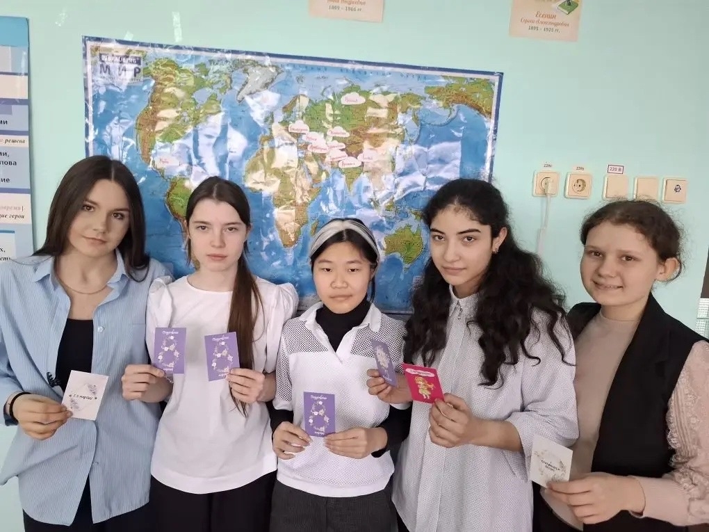 Ученики 8-го класса решили устроить необычный урок, приуроченный к празднику весны. На огромной карте мира ребята отметили уголки планеты, где отмечают Международный женский день. Континенты и океаны украсили яркими цветами, веселыми улыбками и добрыми пожеланиями, демонстрируя единство и дружбу народов нашей Земли.