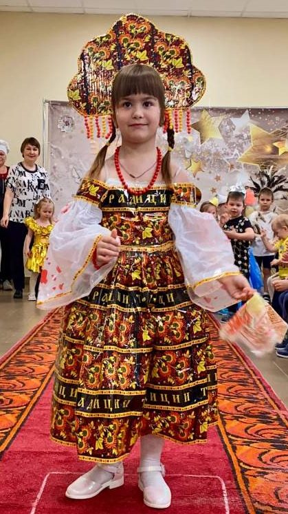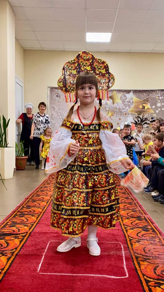 Кульминацией акции стал показ мод, где каждый образ был уникален и неповторим. Участники продемонстрировали фантазию и креативность, представив зрителям целую галерею персонажей: от зажигательной «Испаночки» и страстного «Аргентинского танго» до загадочной «Звезды космоса» и сияющего «Ангела» из полиэтилена. Особое внимание привлекли такие образы, как «Зоркое око» из перьев, «Рыцарь» из металлических крышечек, «Восточная Шахерезада» из конфетных фантиков, «Тимуровец» из газеты и «Королева гламура» из глянцевых журналов. Символичные наряды, отражающие дух дружбы народов и единства, также нашли отклик: «Образ из жаркой Индии» из фольги, «Английский шарм» из обёрток чипсов и, конечно же, величественная «Русская красавица» в наряде с хохломской росписью.