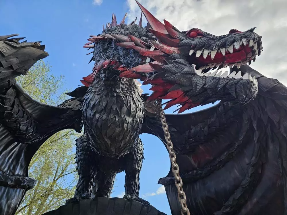 Фигура сразу бросается в глаза. Дракон возвышается на массивной покрышке и будто готов зарычать. Размеры впечатляют: размах крыльев достигает примерно четырех с половиной метров.
