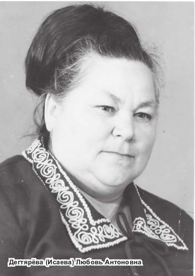 Непростая судьба ожидала и красивую, высокую девушку с тяжёлой косой — Любовь Антоновну Дегтярёву (в замужестве Исаева). Семнадцатилетней девчонкой она добровольно ушла на фронт. Была санинструктором, выносила с поля боя раненых солдат. Всю себя она отдавала важному делу, не задумываясь о себе. Так сложилось, при освобождении Крыма, на Перекопском перешейке, сильно застудила она ноги. Но всё же, после лечения в госпитале, она продолжила воевать. Закончила свой боевой путь Любовь Антоновна в Венгрии, на озере Балатон. За смелость и мужество при обороне Сталинграда, освобождении Румынии, Польши, Чехословакии, Венгрии Любовь Антоновна Дегтярева (Исаева) была награждена орденами и медалями.