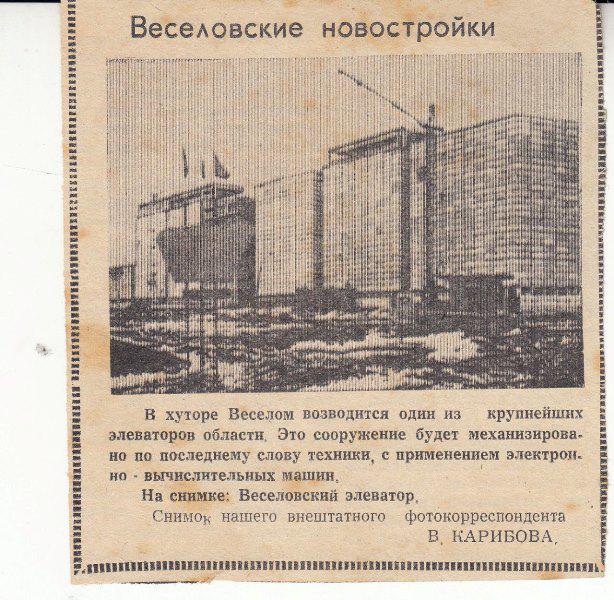 СПРАВОЧНО: 30 декабря 1934 года на территории Веселовского района был открыт пункт по приему зерновых культур «Заготзерно». Материально техническая база состояла из двух складов емкостью 1200 тонн. За годы работы элеватора многое изменилось. ОАО «Веселовский элеватор» являлся многопрофильным предприятием с хорошей материально-технической базой. Веселовский элеватор прожил как годы рассвета, так и годы заката…